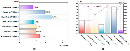Additionally, as depicted in Figure 15, the improved YOLOv8 network still exhibits significantly higher detection accuracy, lower parameter count, and network computational complexity compared to various lightweight convolutional networks.