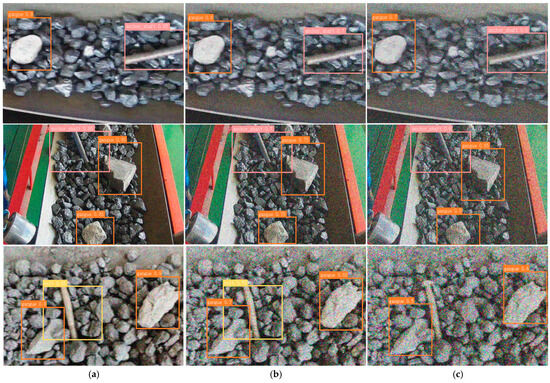 In addition, noise interference is another important factor affecting image detection results. Excessive noise data can interfere with the network model’s accurate judgments during recognition. As shown in Figure 16, we tested the model’s resistance to noise interference on three different non-coal foreign object datasets. As the level of noise increases, there is a certain degree of loss in the model’s recognition accuracy. In the industrial field, erroneous or delayed judgments can pose certain safety risks to the work site. Therefore, it is necessary to apply appropriate image-denoising techniques to the raw data during on-site debugging.