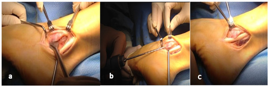 - Van Dijk, P.A.D.; Vopat, B.G.; Guss, D.; Younger, A.; DiGiovanni, C.W. Retromalleolar Groove Deepening in Recurrent Peroneal Tendon Dislocation: Technique Tip. Orthop. J. Sports Med. 2017, 5, 2325967117706673. [Google Scholar] [CrossRef] [PubMed]