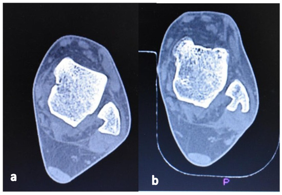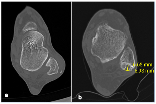 CT scan of a 44-year-old male. (a) Flat malleolus in the preoperative view; (b) CT scan after deepening of the retromalleolar groove.