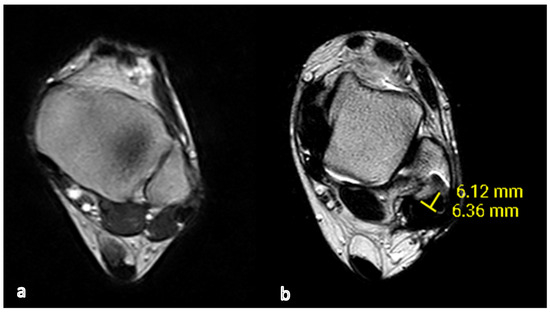 MRI of a 39-year-old male. (a) Preoperative MRI; (b) post-operative view with measurement of the neo-fibular groove.
