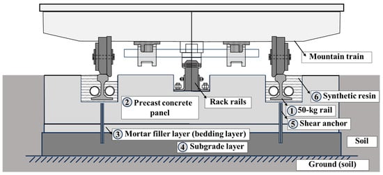 A mountain railway system for tourism was recently developed in the Republic of Korea. Most of the roads, having been designed for automobiles, are characterized by steep slopes and sharp curves. Existing automobile roads are adapted in constructing mountain railways to minimize their environmental impacts. For this purpose, an embedded rail system (ERS) for mountain railway tracks is currently being developed [1,2,3]. As shown in Figure 1, an ERS is a composite concrete railway track system in which rails are affixed to a concrete track using synthetic resin, and rack rails are installed at the center of the concrete panel. One of its key advantages is its ability to be integrated into existing roadways, thereby reducing environmental damage compared to conventional railway track systems. Fixed rails ensure safety and stability while reducing noise and vibrations owing to the absence of direct contact between the rails and concrete panels. The materials and specifications of the structural components of the mountain-ERS are listed in Table 1.