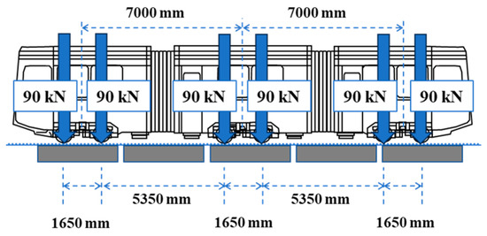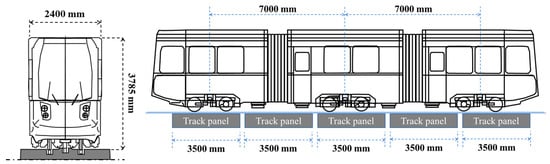 The length and width of a unit of the straight railway track were 3500 and 1700 mm, respectively. The heights of the precast concrete panel, bedding layer, and subgrade layer were 290 mm, 50 mm, and 200 mm, respectively. As shown in Figure 3, the height and width of the train were 3785 mm and 2400 mm, respectively. The mountain train consisted of three connected cars with an interval distance of 7000 mm between them, and the distance between the front and rear wheels was 1650 mm.