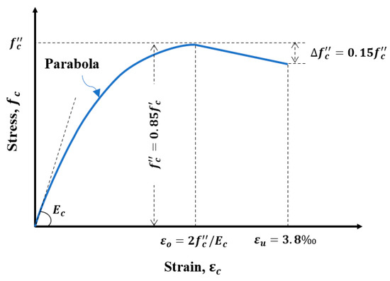 For the compressive behavior of the concrete material, the stress–strain model presented by Hognestad [13] was applied. The stress–strain relationship for compression is shown in Figure 5.