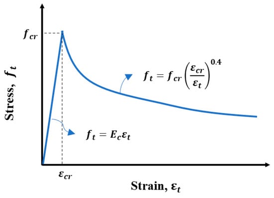 Concrete is a brittle material that is vulnerable to tension; therefore, its tensile behavior is determined by evaluating its tensile strength. When concrete is subjected to a tensile force, it exhibits a linear behavior up to the peak strain () at which cracks occur, and a nonlinear response thereafter. The stress tends to decrease as the strain increases. In the structural analysis model used in this research, the stress–strain model used for the tensile behavior of concrete was presented by Wang and Hsu (2001) [14]. An equation (presented in the CEB-FIP model code) was used for the peak tensile stress of the concrete [15] (Equation (6)). A linear relationship exists until the strain reaches the peak at which the crack occurs, and the part that exceeds the strain is presented as an exponential function. The stress–strain model for the tensile behavior is shown in Figure 6.