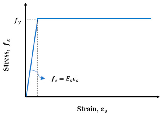 The 50-kg rails and reinforcing bars inside the concrete panel were made of steel with yield stress of 800 Mpa and 400 Mpa, respectively. The elastic modulus of both components was 210,000 GPa, and the Poisson’s ratio was assumed to be 0.3. For each steel component, bilinear stress–strain models were applied, as shown in Equations (7) and (8) and Figure 7.