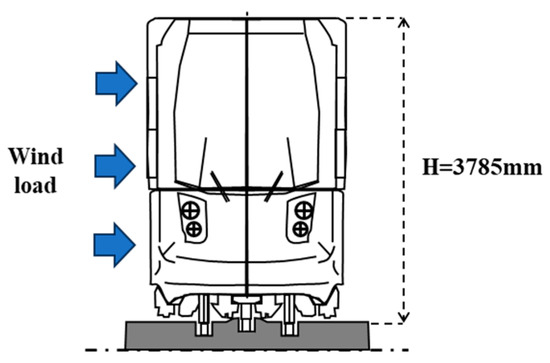 The wind load (transverse load) was calculated using the train dimensions. To calculate the wind load (), the following equation presented in KR C 08020 [16] was used to calculate the wind load ():