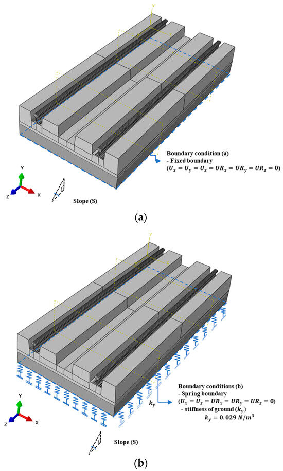 The ground was not directly modeled to construct a structural analysis model of the railway track system. Instead, it was simulated as a boundary condition consisting of a fixed-end support condition and an elastic spring support condition. Detailed explanations are provided in Section 2.5.