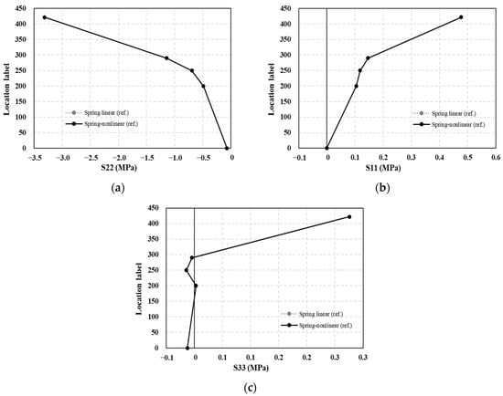 Comparison of values based on linear and nonlinear analyses: (a) S22 (y-axis), (b) S11 (x-axis), and (c) S33 (z-axis).