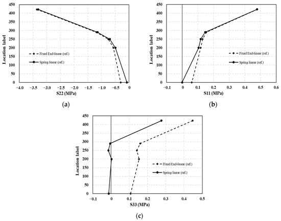 Stress tendency along three directions. Fixed-end and spring support models: (a) S22 (y-axis), (b) S11 (x-axis), and (c) S33 (z-axis).