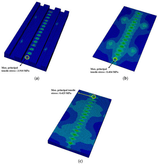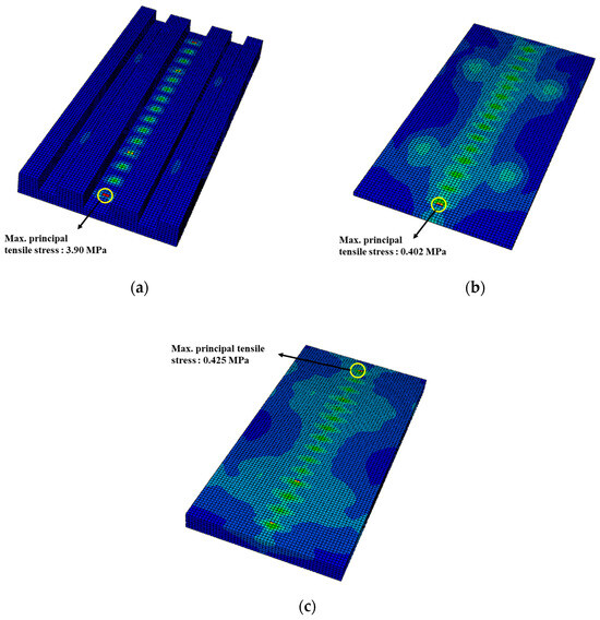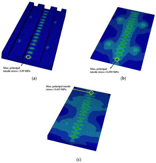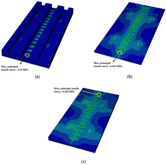 Principal stress contours and locations of the maximum principal tensile stresses of concrete elements (example: subgrade thickness = −150 mm): (a) precast concrete panel, (b) bedding layer, and (c) subgrade layer.
