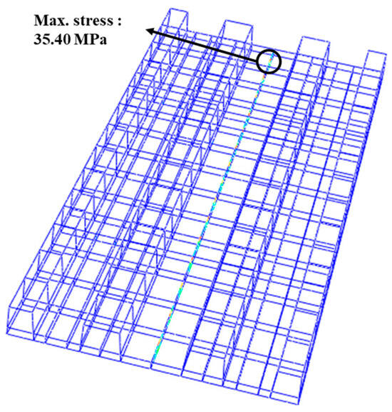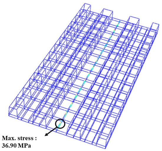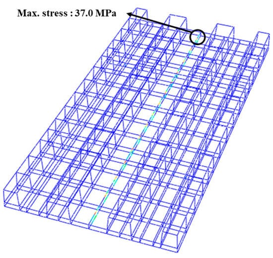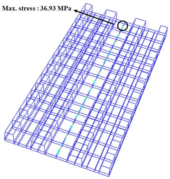 For the reinforcing bars, a von Mises stress of 36.93 MPa was generated at the position where the longitudinal loads on the rack rail were installed, which was lower than the yield strength of the reinforcing bars (400 MPa).