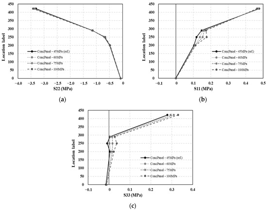Comparison of analyzed results with the material change of the precast concrete panel: (a) S22 (y-axis), (b) S11 (x-axis), and (c) S33 (z-axis).