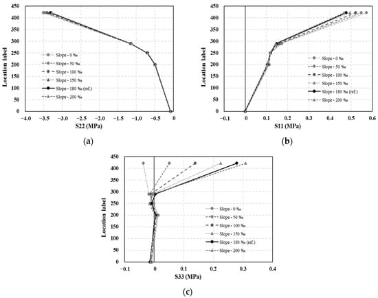 The stress inside this section is shown in Figure 22. In the case of S22, slight differences in the values were observed at the position where the precast concrete panel contacted the 50-kg rails as the gradient of the mountain-ERS changed; the stresses, on the other hand, in the bedding and subgrade layers exhibited similar trends. For S11, a trend similar to that of S22 was observed; the tensile stresses increased slightly as the gradient of the mountain-ERS decreased, particularly when the precast concrete panel contacted the rail.