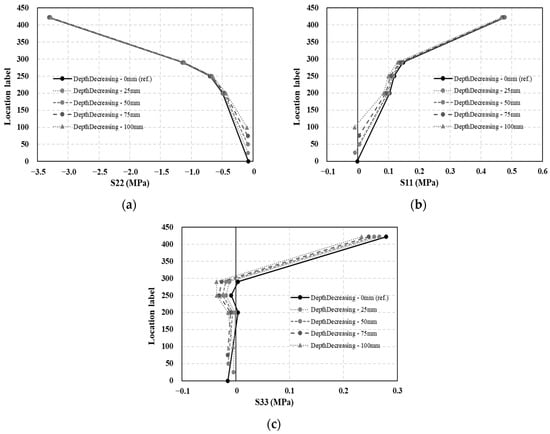 Comparison of analyzed results as a function of the thickness of the subgrade layer: (a) S22 (y-axis), (b) S11 (x-axis), and (c) S33 (z-axis).