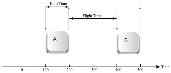 Researchers can collect many different features from the typing patterns of users. The most widely used is keydown–keydown latency, which is the time taken for a user to press two consecutive keys [2,5]. It may be divided into two timing measures: keydown–keyup of the first key, known as the hold-time or dwell-time, and keyup–keydown of the first and second keys, known as the flight-time; see Figure 1. Timings involving more than two consecutive keys can also be measured, although they are less common in the literature, as are other measures such as collecting data on key pressure, typing speed, total duration and typing errors [5]. Using these features, a system may either be an anomaly detection system or a classification system. An anomaly detection system is one that is trained on the examples generated by the user, and when a new sample needs to be tested, it is compared to the model of the user saved in the system. The second approach is to use classification, where a system is trained on two or more users, and a new sample is classified into a user category during testing.