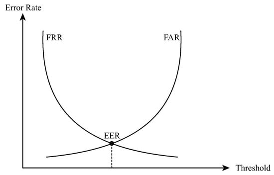 Figure 4. The relationship between EER, FAR, and FRR. - Zero-miss false alarm rate (ZM-FAR): This measure ensures that no attacker can gain access to the system by selecting a threshold value such that the miss rate of attackers is zero. ZM-FAR prioritises security by not accepting imposters at the expense of increasing FRR values. Note that the letter “A” in ZM-FAR stands for alarm and not acceptance.