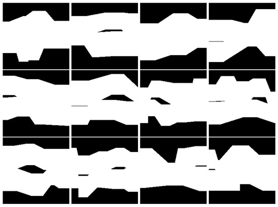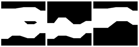 A total of 5000 channel shapes were created through the process described in Section 2.1. The 5000 samples were then flipped upside down to double the quantity to 10,000. For all shapes, the samples were used as input into the NN, where pixels inside the binary array indicated the wall and fluid regions by 0 and 1, respectively. The data values obtained using the CFD tool in the domain were converted into target data by assigning the simulation results at the center position of each pixel set in the fluid region to an empty array with dimensions of . As a result, we constructed a dataset with 10,000 sets of an input channel shape and corresponding target fields. For the training, validation, and test datasets, we randomly selected and divided the generated samples into 8000, 1000, and 1000 cases, respectively.