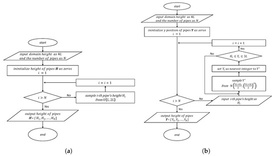 The size of the domain used in the experiment was set to . The number of pipes was selected by generating a random integer between three and seven, and the hyperparameter was set to 20. In addition, to create a higher serial pipe, the lower serial pipe was inverted in the y-direction, following the aforementioned procedure.