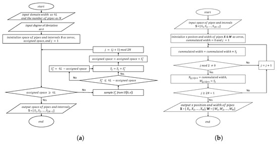 Flow diagram for determination of the Width and x positions of rectangles consisting of lower serial pipes. From left to right: (a) spaces of pipes and intervals, (b) x position and width of pipes. The superscript * represents a variable used as an intermediate step to determine the actual value.