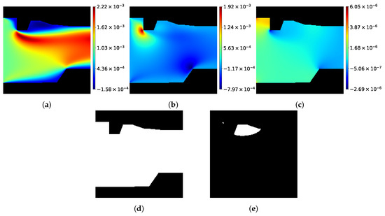where ∇, V, P, and denote the del operator, velocity vector, kinematic pressure, and constant mass density of the fluid, respectively. Our models were set to the laminar because our inlet velocity was low enough. To generate the target data, the SIMPLE algorithm [32] was used for the CFD solution. During post-processing, the corner vortex region near the wall was calculated as the region of interest (RoI) to compare the accuracy at the region. A sample set of fields in the target data is shown in Figure 5, where the channel region is highlighted in black to enhance the distinction between the wall and fluid regions.