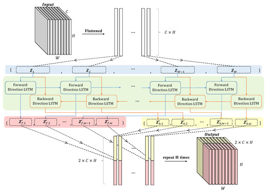 To solve the problems of the existing network model, a module was designed based on bidirectional LSTM, which has shown strength in filling in words through context in natural language processing [33]. Generally, when dealing with dynamic data in deep learning, LSTM has been mainly used for time series data learning [34]. However, there have been studies using the concept of bidirectional LSTM for character inference within images in the field of image processing [35,36] The SB-LSTM module was inspired by this CNN-RNN combined approach.