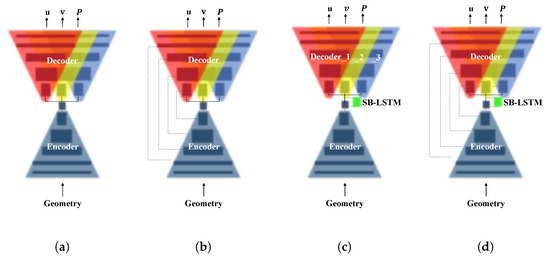 The effectiveness of the SB-LSTM module was evaluated on two baseline models, ED and U-Net. These two models were adopted because they were used to train internal flow datasets in [1] and [27] and have also been referenced in many other papers regarding obtaining steady state solutions. ED consists of an encoder and decoder, and U-Net is an extension of ED with skip connections. In both models, the SB-LSTM module is attached at the latent space, and the structural comparison of the four different methods is depicted in Figure 8.