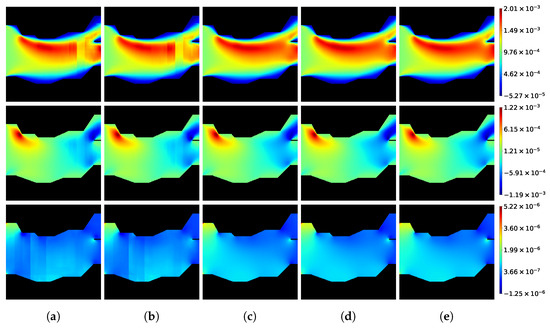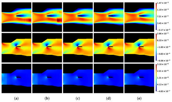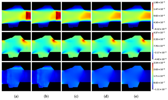 The target field predictions of the four different models are visualized in Figure 10, Figure 11, Figure 12, Figure 13 and Figure 14. The representative data in each figure are for cases with a nearly constant vertical cross-sectional area, converging, diverging, converging–diverging, and diverging–converging, respectively. The colorbar range was determined by calculating the minimum and maximum values of predictions and targets for each case. In this section, the focus is mainly on the differences between the models with and without the SB-LSTM module, as the differences between the models that include the SB-LSTM module are not clearly visible within the range that encompasses the results of all four models. The qualitative comparison between models with SB-LSTM is visualized in Figure A1, Figure A2, Figure A3, Figure A4 and Figure A5 of Appendix A.