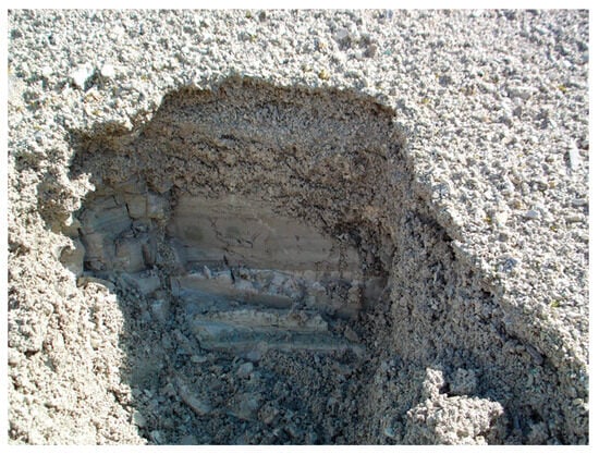 The comprehensive decommissioning of the chemical plant involved, for example, demolishing the facilities and all installations, constructing an engineered landfill, including associated infrastructure, the removal of the existing waste storage areas, the treatment of contaminated groundwater, upgrading and operating the existing water treatment plant, and regulating the Stoła river, including the revitalization of its glacial valley. The total amount of waste gathered at the plant, including the contaminated soil from underneath the dumping grounds, the contaminated soil from the plant grounds, the hazardous waste generated during the demolition and removal of processing installations, was estimated at about 1.5 million m3 []. During the removal of waste storage area No. 5, after its dismantling but before its transfer to a properly secured engineered landfill, the waste was chemically stabilized at solidification points by mixing with a 10% slag cement (CEM II/B-S-32.5 R) addition, in order to improve its mechanical properties, particularly its strength. The waste was mostly like a very soft cohesive soil (Figure 2), and because it was stored in the form of tall embankments (up to 17 m), it was likely that it had lost its stability due to the formation of sliding surfaces crossing the waste embankment, as the waste was characterized by a near-zero shear strength.