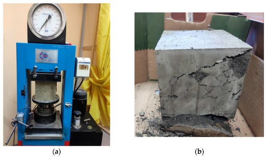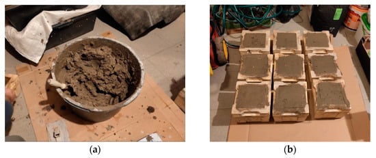 Samples in the shape of cubes with a side of 15 cm were formed from the mixture and covered for maturation, which took place at a constant temperature and humidity, close to natural conditions (see Figure 3b).