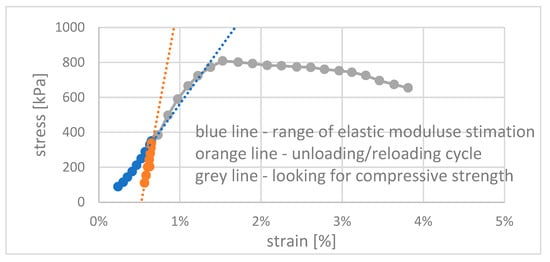 When a test is performed in laboratory conditions, it makes it possible to control several unloading/reloading cycles. Elastic modulus may be derived from the stress–strain curve. In the test, two procedures were applied, depending on the number of unloading/reloading cycles. If the sample was unloaded/reloaded only once, the cycle was scheduled at 50% of expected compressive strength. One may observe a very significant increase in the material stiffness in the first unloading/reloading cycle and a further increase in the second cycle in Figure 5.
