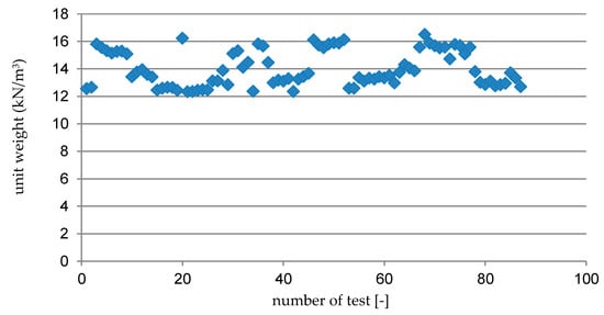 Physical parameters of the waste were also determined during the tests. Before each shearing and immediately following the test, its moisture content was determined. The unit weight of the stabilized waste was determined based on samples used for the shearing tests. The samples were weighed, measured (sample side and height dimensions), and the unit weight was calculated as follows (Equation (3)):