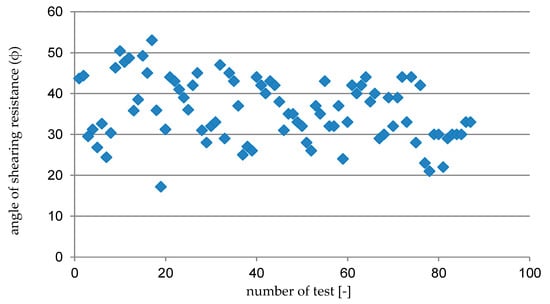 Knowing the - relation made it possible to plot an approximation line (Figure 6). If the deviation of any point from this line exceeded 25% of the  value, such points were discarded, and the test was repeated. In total, 435 shearings were conducted.