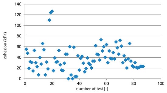 The authors still support their statements that proper numerical modelling of geotechnical problems related to improved soils requires individual testing of the resulting composites, concerning optimal composition (binder, additives) [] and their final mechanical properties. That last issue is usually underrated, as most of the published results refer to the standard 28-day time of curing. The authors’ recent experience proves the necessity of prolonging the curing times of the DSM samples up to two or even three months to gain valuable and reliable information []. But this should always be tested individually and there is no real chance to obtain juxtaposed data for all possible combinations of soils and binders. Even the actual temperature may be a crucial factor concerning the final composite quality.