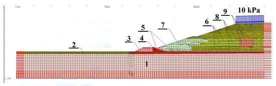 The calculation analysis was divided into the following stages. First, a primary stress condition was generated in the ground. Secondly, the construction of subsequent layers of artificial fills was simulated. The next stage was to assume a load on the site crest to simulate the operation of heavy equipment (excavators, transport vehicles) in the form of an evenly spread load with a value of 10 kPa (Figure 10). The final stage of the calculations, which is key to this discussion, was stability analysis.