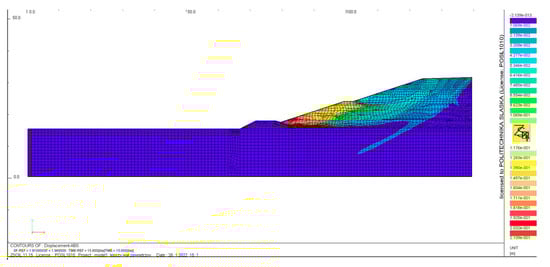 The calculation analysis demonstrated that the planned engineered landfill, where the slag cement-stabilized waste would be placed, would be characterized by a safety factor of 1.71. The map of absolute displacements when stability is lost is shown in Figure 11. The analysis of Figure 11 indicates that a local loss of stability occurs in the external slope of the embankment surrounding the engineered landfill. The formation of a global sliding plane in the central part of the storage site also begins to be visible. When using a material with a greater grain size than sand and a greater index of density (ID > 50%), characterized by strength parameters of ϕ = 40°, c = 1 kPa, the safety factor increases to SF = 1.91, the character of engineered landfill damage also changes (Figure 12)—a global loss of stability occurs, and the shear plane crosses the waste in the landfill.