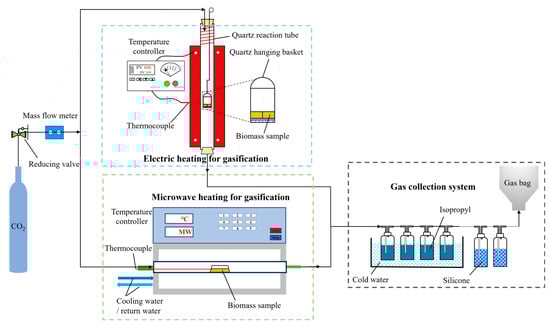 The properties of the products obtained via different heating methods vary considerably. Electric and microwave heating have been studied [30,31,32]. In contrast to electric heating methods, which rely on the conduction of heat from the surface to the core of a material through the temperature gradients, microwave heating operates by converting electromagnetic energy directly into heat at the molecular level [33]. The utilization of microwave heating demonstrates a rapid heating rate and the advantages of volumetric and uniform heat distribution. Many studies have reported that secondary cracking reactions are promoted in microwave pyrolysis [34,35]. More syngas and less tar are produced for microwave gasification than other conventional gasification under the comparable conditions [34,36,37,38]. Syngas from gasification could be applied in heat and power production and as feedstock for the synthesis of fuels. Tar could be highly toxic to the atmosphere and the environment. These characteristics contribute to reducing potentially harmful product formation and mitigating emission pollutants, thereby establishing the technique as environmentally sustainable [8,9,10,11]. Some researchers have already conducted gasification experiments using electric heating methods on biomass in fixed-bed systems [39,40,41]. Furthermore, many articles have been published regarding microwave pyrolysis on biomass, focusing on analyzing syngas and biochar properties [11,42,43,44,45,46,47,48]. There have been notable advancements in the utilization of microwave heating compared to conventional heating methods, and significant strides have been made in the field of biomass pyrolysis. There remains a lack of research about the application of microwave technology in biomass gasification. In previous studies on the MG of biomass, the components of syngas and tar were mostly characterized, but few articles were reported about the properties of biochar. Less work compares EG and MG at the same time. In this study, syngas, tar, and biochar properties are characterized in detail through the experimental study of two different biomass samples under EG and MG. Compared with EG, MG has obvious advantages in producing syngas and microporous biochar. This study provides effective data support for the practical application of biomass gasification.