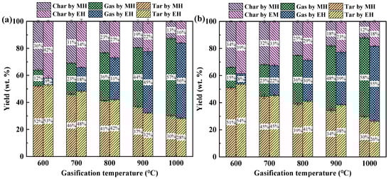 Figure 2 illustrates the effects of gasification temperatures and two heating methods on the mass yields of syngas, tar, and biochar derived from oak and corn stalk gasification. As the gasification temperature increases from 600 to 1000 °C, the syngas yield increases while the tar and biochar yields decrease. The increase in the gasification temperature enhances the pyrolysis and oxidation reactions during the process. This leads to higher consumption of solid raw materials converted into volatile gases. Furthermore, higher temperatures promote the processes of tar cracking and reforming.