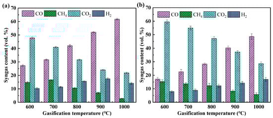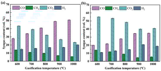 Figure 4a shows the syngas components from corn stalk MG. As the gasification temperature increases from 600 to 1000 °C, the volume fraction of CO increases from 27.3% to 61.8%, while that of CO2 decreases from 47.8% to 21.9%. The syngas content of EG is shown in Figure 4b. The volume fraction of CO increases from 27.9% to 50.8%, while the volume fraction of CO2 decreases from 55.1% to 23.3%. MG produces more CO than EG at the same temperature. Char particles can absorb the microwave energy, resulting in a higher temperature than the surroundings during MG [36]. Under the same heating conditions and temperature, the gaseous products of corn stalk gasification contain less CO2 than those of oak gasification. Oak is a hardwood, and the specific surface area and pore volume of oak char are lower than those of corn stalk char. The porous structure of the materials promotes the char self-gasification reaction.