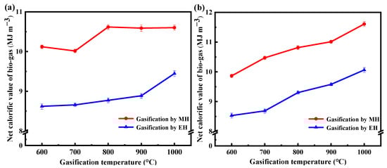 The net calorific value of syngas is calculated from the relative content of syngas through Equation (5). As shown in Figure 5, the net calorific value of syngas increases with temperature. At 1000 °C, the highest net calorific values of syngas derived from oak gasification are 10.60 and 9.45 MJ m−3 (Figure 5a), while the highest net calorific values of syngas generated from corn stalk gasification are 11.61 and 10.06 MJ m−3 (Figure 5b). As the gasification temperature increases, the content of CO and H2 in the syngas components gradually increases. The net calorific value of syngas generated from MG is higher than that from EG at the same temperature.