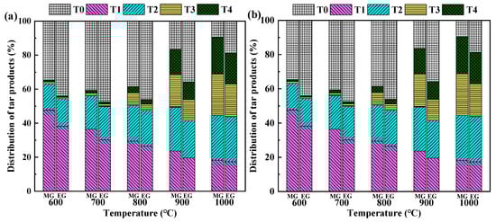As shown in Figure 6, the increasing gasification temperature gradually decreases the amount of T1 tar but has less impact on T2 tar. Furthermore, the contents of T3 and T4 tars are increasing significantly. Additionally, the concentration of T0 tar initially increases and then decreases. The T1 content of corn stalk MG decreases from 47.7% to 18.2% as the temperature increases from 600 to 1000 °C, representing a decrease of 29.5%. Additionally, the contents of T2, T3, and T4 increase from 15.6%, 1%, and 0.9% to 26.3%, 24.3%, and 21.5%, indicating an increase of 10.7%, 23.4%, and 20.6%. The T0 tar exhibits a decline in content, ranging from a peak of 40.7% at 700 °C to a nadir of 9.6% at 1000 °C (Figure 6a). The yield of T1 tar decreases from 38.2% to 17.3% when the temperature increases from 600 to 1000 °C. Additionally, the contents of T2, T3, and T4 increase from 16.2%, 0.8%, and 0.5% to 26.3%, 19.3%, and 18.2%, respectively. The content of T0 tar shows a similar pattern, with a peak of 47.5% at 700 °C (Figure 6b). It is worth noting that the increases observed in MG are higher than those in EG. This study shows that MG produces tars with more benzene rings than EG. The tar components derived from oak gasification are identical to those from the corn stalk and are unaffected by the heating methods. Alkali and alkaline earth metals (AAEMs), such as K, Na, Ca, and Mg, extensively occur in the biomass growth process and significantly affect the biomass gasification process. AAEMs could promote the secondary reaction of tar and affect the polycondensation conversion of tar. AAEMs improve the release of specific T1 compounds and enhance the content and species of T1 compounds in tar. AAEMs could also inhibit the release of T2–T4 compounds. According to Ren et al. [53], AAEMs promote the generation of fracture decomposition of long-chain alkanes during the gasification process.