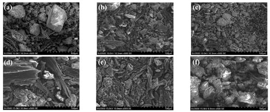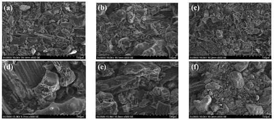 SEM images of oak chars derived from MG and EG under different temperatures: (a) 600 °C MG, (b) 800 °C MG, (c) 1000 °C MG, (d) 600 °C EG, (e) 800 °C EG, and (f) 1000 °C EG.
