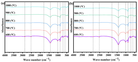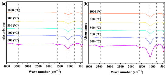 As shown in Figure 10, the characteristic peaks in corn stalks have distinct locations from those in oak char. Specifically, the absorption characteristic peaks are identified at 1600–1800 cm−1, corresponding to the C=C vibrational intervals of aromatic or thick aromatic rings. Also, 1200–1000 cm−1 peaks represent the telescopic vibrational intervals of -OH groups. Furthermore, two peaks are detected at 1000–450 cm−1, specifically at 797 and 469 cm−1, corresponding to the C-H vibrational intervals of different aliphatic groups in corn stalk char. The absorption peaks of each functional group of biomass char from MG exhibit a lower intensity than that from EG. The gap between the two heating methods gradually decreases as the temperature increases. The evidence suggests that MG is more beneficial than EG at lower temperatures.