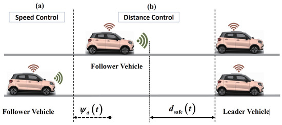 ACC structure (brown pattern represents the signal being sent out and green pattern represents the signal being received): (a) when the follower is far away from the leader, speed controller adjusts the follower vehicle’s speed to the reference velocity; (b) when the follower vehicle approaches the leader vehicle, distance controller is designed to adjust the distance between the follower and the leader.