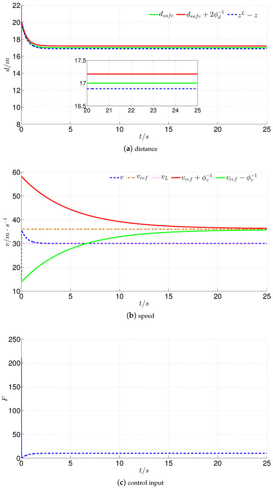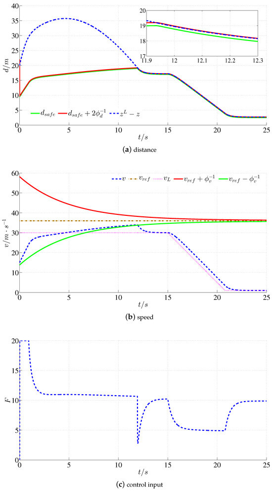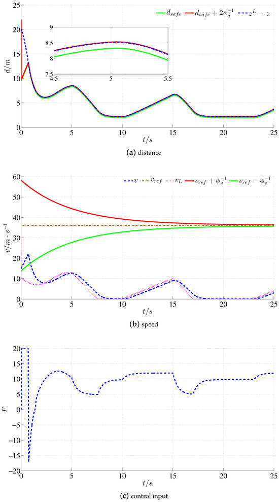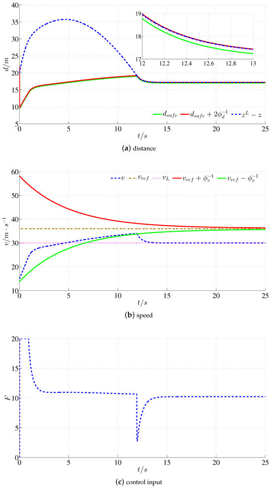 Simulation results of scenario 1: (a) distance curves, distance is limited in the prescribed safe range within 12–25 s; (b) speed curves, speed is limited in the prescribed safe range within 0–12 s; (c) control input, distance control within 12–25 s and speed control within 0–12 s.