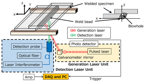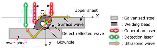 In-process monitoring requires establishing a measurement method that can be applied in high-temperature and high-noise environments during welding. However, conventional non-destructive inspection methods such as ultrasonic testing (UT) require a transducer to contact the measurement target to acquire internal information, making it difficult to apply and automate such methods in high-temperature environments. Thus, a non-contact method is desirable. Several methods can be used for this purpose such as the X-ray method [3], an ultrasonic method using buffer rods [4], electromagnetic ultrasonic method [5], airborne ultrasonic method [6], and laser ultrasonic method [7]. Among them, the laser ultrasonic method, in which ultrasonic waves are excited by irradiating a pulsed laser onto the target surface, and the ultrasonic waves propagating inside or on the surface and reflected at various interfaces are received by a laser interferometer, is suitable for in-process monitoring due to the following features. (1) Using a laser as a probe allows non-contact measurement with the object. (2) The point-to-point measurement by lasers makes it applicable to narrow areas. (3) Optical mirrors and mechanical stages can scan the lasers, and information on ultrasonic propagation at multiple points can easily be obtained. With these features, it has been used for defect measurement [8,9] including the detection of internal defects [10,11,12,13]. In addition, there have been many research reports on plate thickness measurement [14] and material evaluation [15,16].
