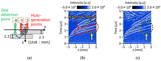 Static measurements were taken under the positional conditions of generation and detection, as shown in Figure 4a. The generation gap Δx was 0.1 mm, and the generation range was set to −3~3 mm. As a result, the number of generation points was 61. The measurement result for a defect-free cross-section (“Reference” in Figure 3) is shown in Figure 4b, and that for a defective cross-section (“Defect” in Figure 3) is shown in Figure 4c. The red boxes in the figure include the longitudinal reflected wave on the back surface and conversion from longitudinal to transverse wave. The comparison of the area indicated by the yellow circle shows that attenuation was observed in the presence of defects. This generation and detection points arrangement allows the affected waves transmitted through the defect to arrive after the surface lateral waves and before the Rayleigh waves, making it possible to evaluate the signal attenuation.