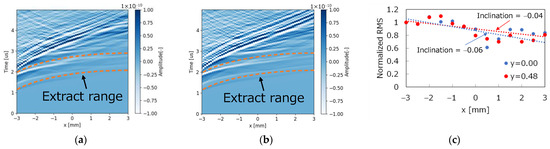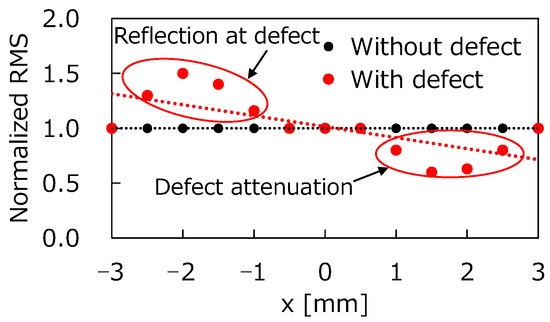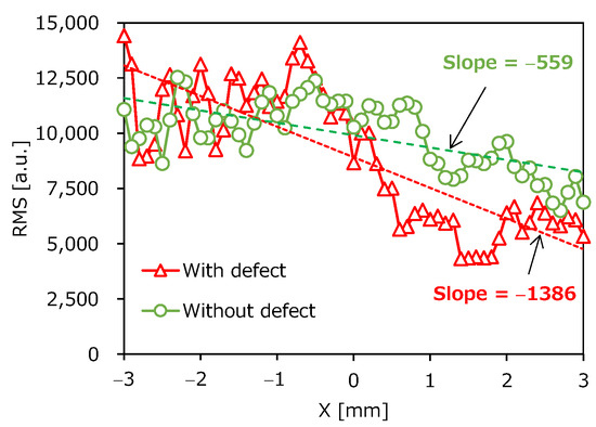 The area containing the focused wave was extracted, and the root mean square (“RMS”) within the extraction area was calculated for each generation position as a measure of signal intensity. Figure 5 shows the RMS distribution. The slope values of those plots were used to determine the presence or absence of a defect in the x > 0 region, where the attenuation could be observed. In practice, a slope calculation was performed on the distribution normalized by the RMS distribution obtained for the defect-free section. Therefore, if the slope value was negative, it was judged that attenuation had occurred (i.e., that a defect was present).
