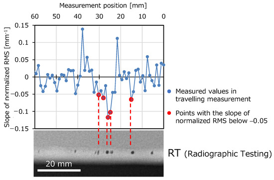 Next, the traveling measurement was performed to measure the cross-section continuously while moving the specimen in the y direction. Continuous inspection for defects while moving in the direction of the weld line is possible because laser ultrasonics is a non-contact measurement. The measurement range was within the dotted line shown in Figure 3. The traveling speed was set to 0.5 m/min, and the generation point gap Δx was increased to 0.5 mm to reduce the number of generation points per cross-section and to improve the spatial resolution in the y direction. With the number of generation points per cross-section reduced to 13, the y-movement distance required to acquire a single B-scope (i.e., the spatial resolution in the y-direction) was determined to be 1.08 mm. Figure 6 shows the correspondence between RT and the defect detection indicator value calculated by applying the previous judgment method to the traveling measurement. It can be seen that there was a correspondence between the portion of the slope value, which is the detection indicator for each cross-section, above a certain value, and the location of the defect in the RT image. On the other hand, it could be observed that the magnitude of the detection indicator for defects varied. The reason for the variation in the detection indicator is that the slope of the underlying signal distribution, in other words, the attenuation, is different. This variation can lead to a difference in the detection of defects depending on the setting of the threshold value.
