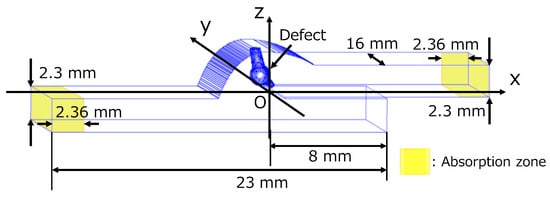 The constructed model was a three-dimensional model, as shown in Figure 7. The material parameters of the base material in the analysis were assumed to be steel with a longitudinal wave velocity of 5900 m/s, transverse wave velocity of 3200 m/s, density of 7900 kg/m3, and the defective area as a vacuum. This is because the inner space of a blowhole caused by zinc vapor is almost a vacuum containing only a small amount of hydrogen, and zinc is believed to adhere to the inner wall during the cooling process [20]. Even if zinc vapor or other substances remain in the defect due to insufficient cooling, it is safe to treat the defect as a vacuum because the waves are almost completely reflected from the viewpoint of acoustic impedance.